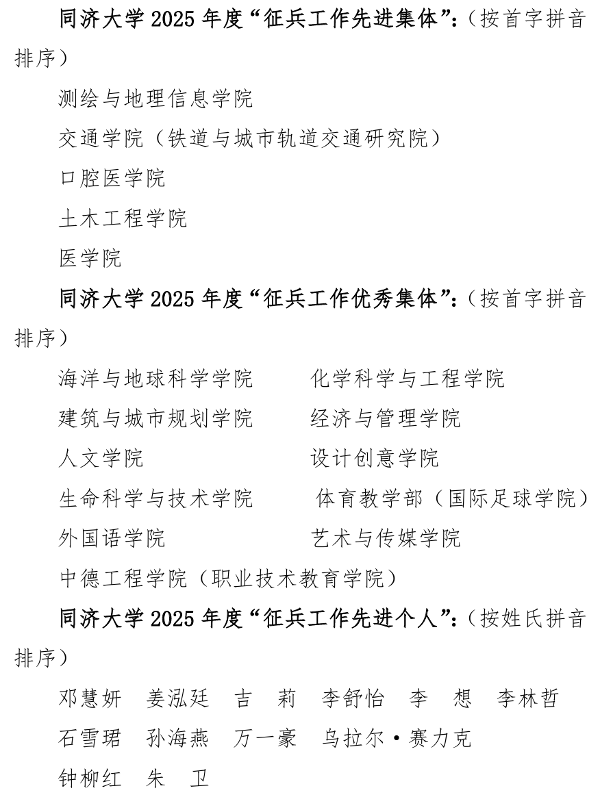 武装部副部长徐汉明汇报了2025年度同济大学征兵工作情况,通报了2026年校征兵工作任务及进展。2025年,同济大学征兵工作再创佳绩,共有17名优秀学子光荣入伍,其中毕业生7名,圆满完成了上级下达的指标任务。测绘与地理信息学院、交通学院(铁道与城市轨道交通研究院)、口腔医学院、土木工程学院、医学院等5个学院不仅完成上站任务,更实现了毕业生入伍的突破;海洋与地球科学学院、化学科学与工程学院、建筑与城市规划学院等11个学院较好完成了上站任务。学校征兵工作持续保持高质量推进。