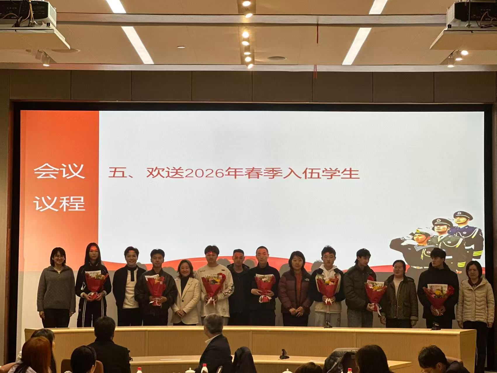会上,各学院老师向2026年春季即将入伍的7名同学(6男1女)献花,校党委副书记刘润勉励他们在部队“大熔炉”中锤炼意志、增强才干,赓续红色血脉,传承报国基因,为校争光,为国添彩。